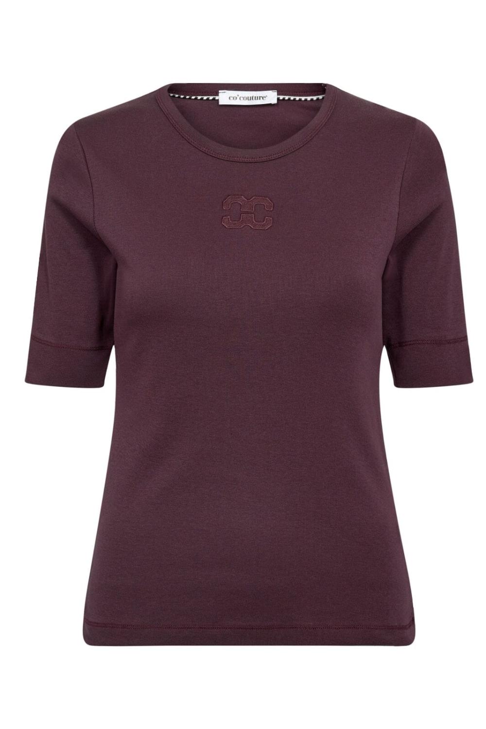 Vinröd t-shirt från Co'Couture i ekologisk bomull. T-shirten har rund halsringning och halvlånga ärmar med en diskret broderad logotyp på framsidan.