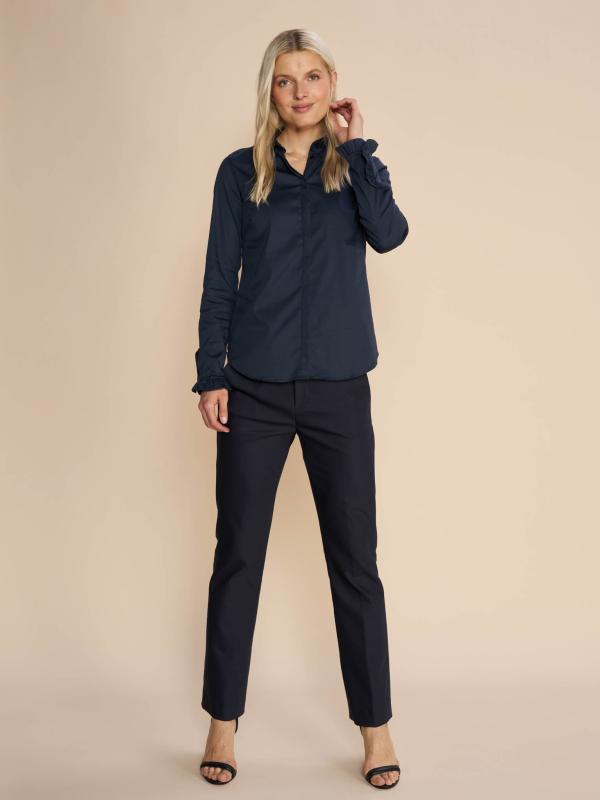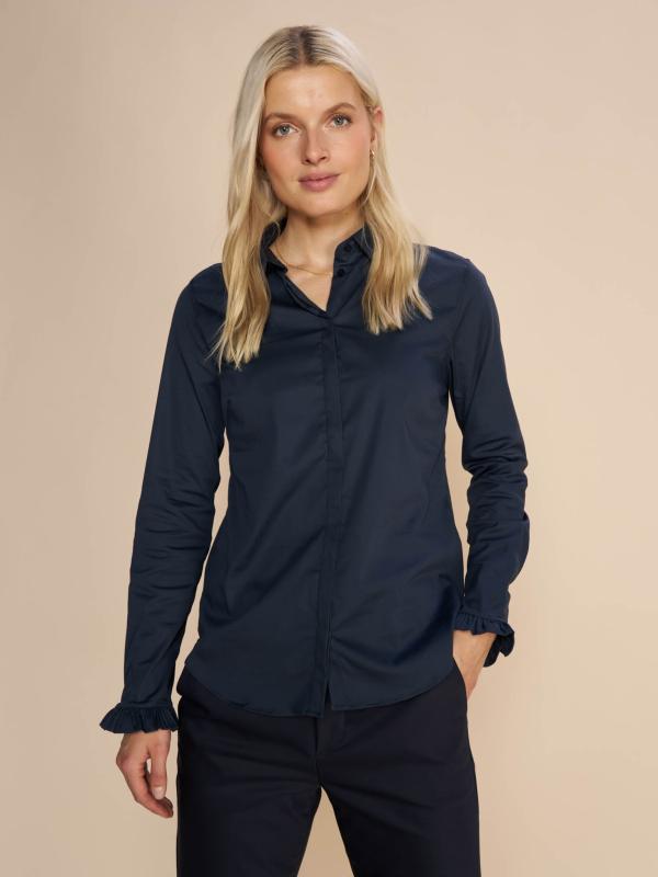 Looking to add a feminine touch to your outfit? Cut in a flattering slim fit, crafted in the softest stretchy fabric with a classic collar, feminine ruffled cuffs, and classic button closure. Style it with tailoring and let the ruffled cuff peep out from the sleeves.