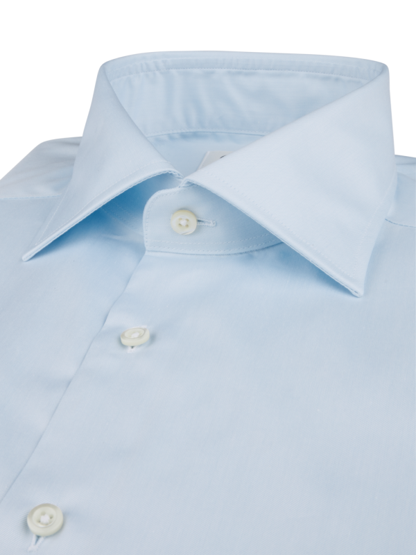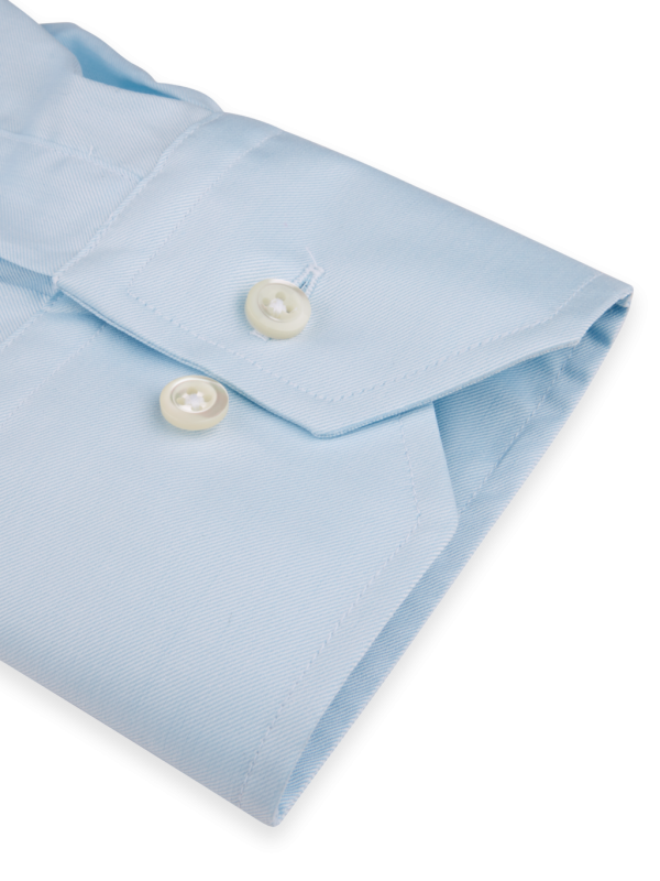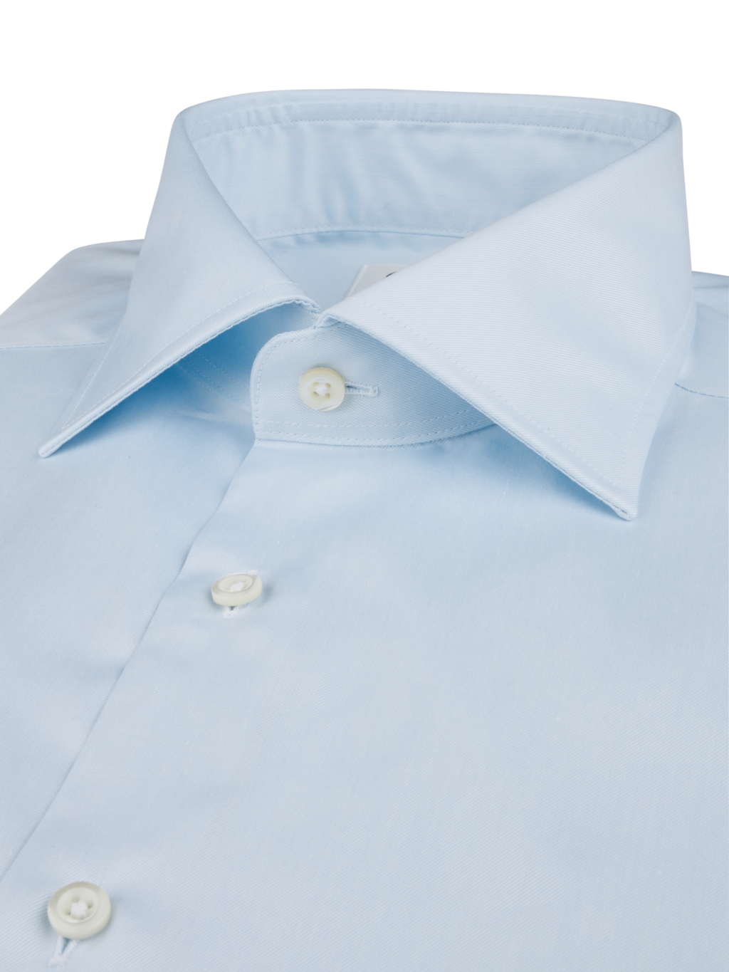 An essential piece in anyone's wardrobe, this sophisticated light blue shirt is a great way to upgrade your wardrobe. It’s made from twofold super cotton and cut for a slim fit. It's finished with twobuttoned cuffs and a moderate cut away collar. It will take you from work to a night out. We thinkit works best with tailored pants.