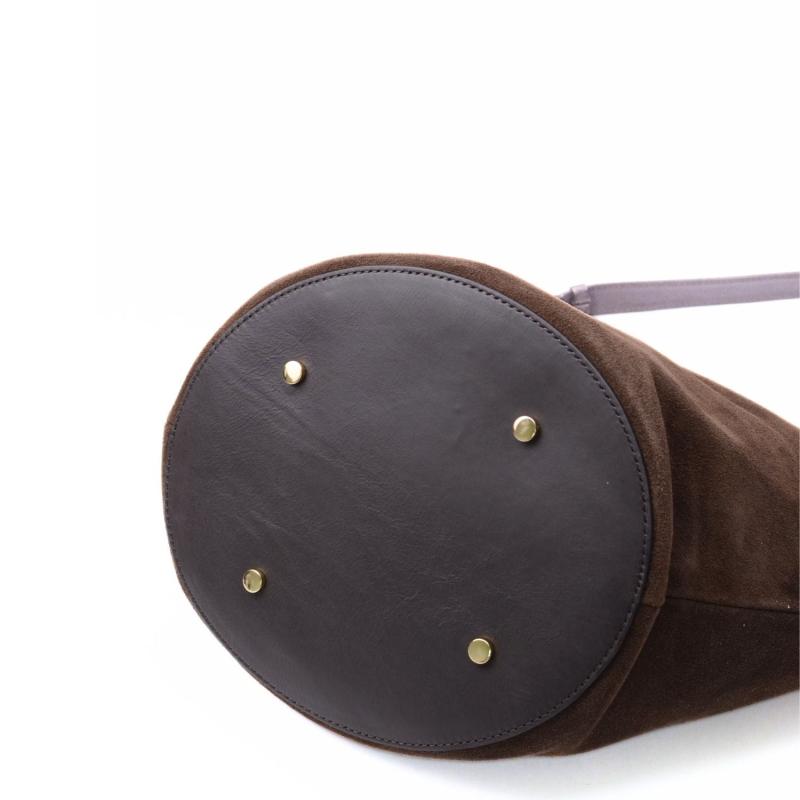 Stor shoppingväska i äkta mocka med botten och handtag i nappaläder. Väskan stängs med dragkedja upptill. Invändigt finns ett fack med dragkedja och två små öppna fack.