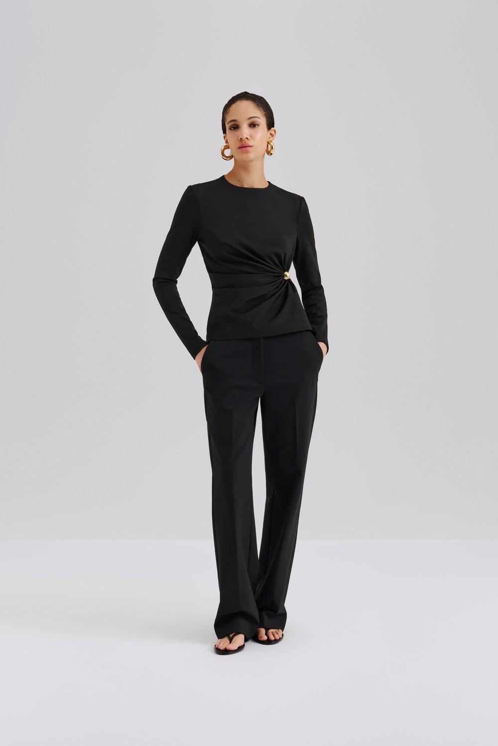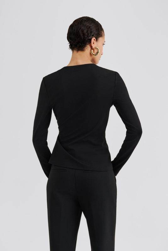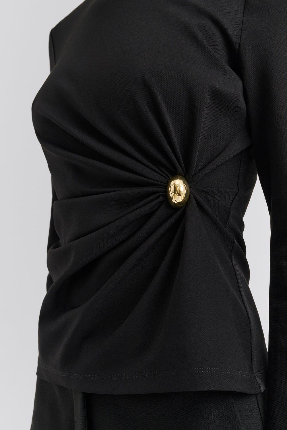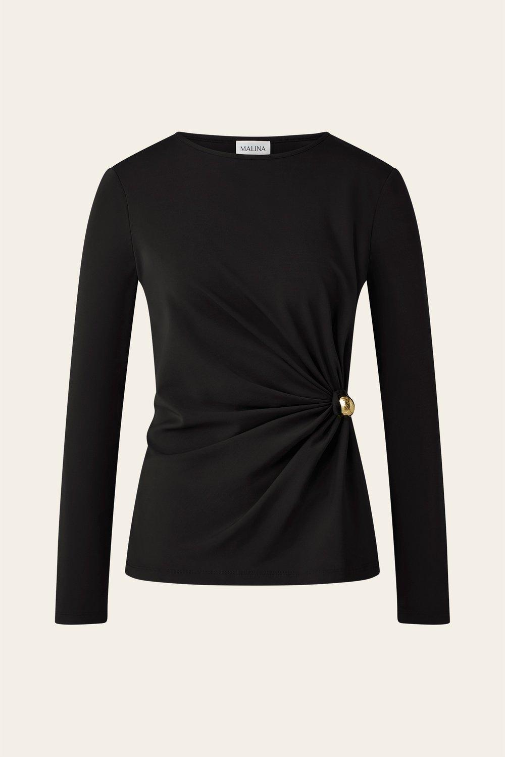Jersey topp med lång ärm, draperad midja och guldfärgad detalj.