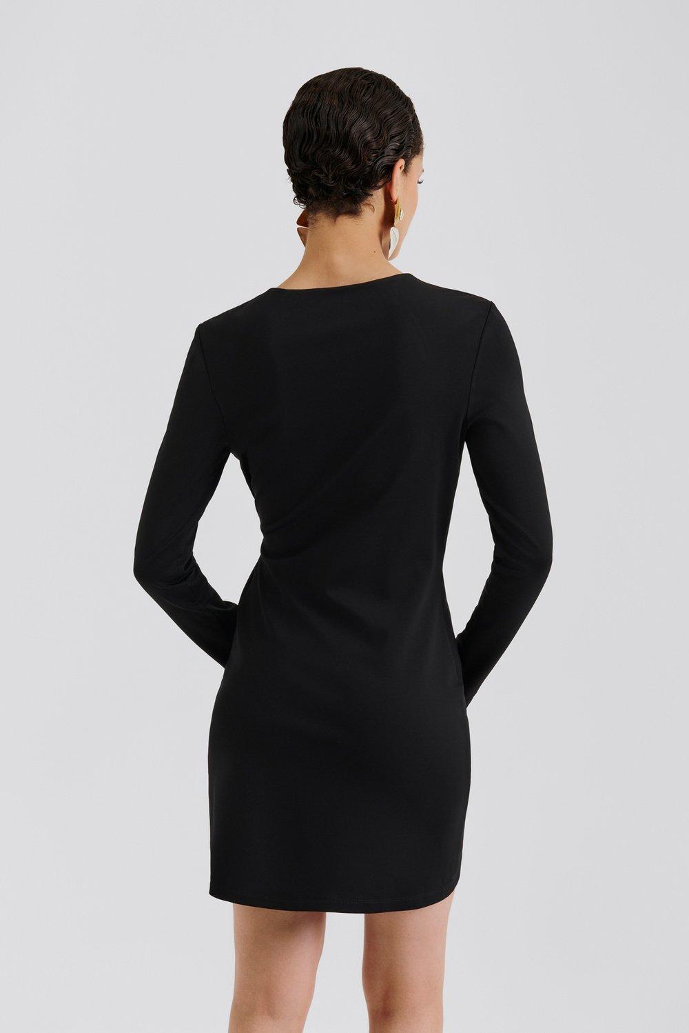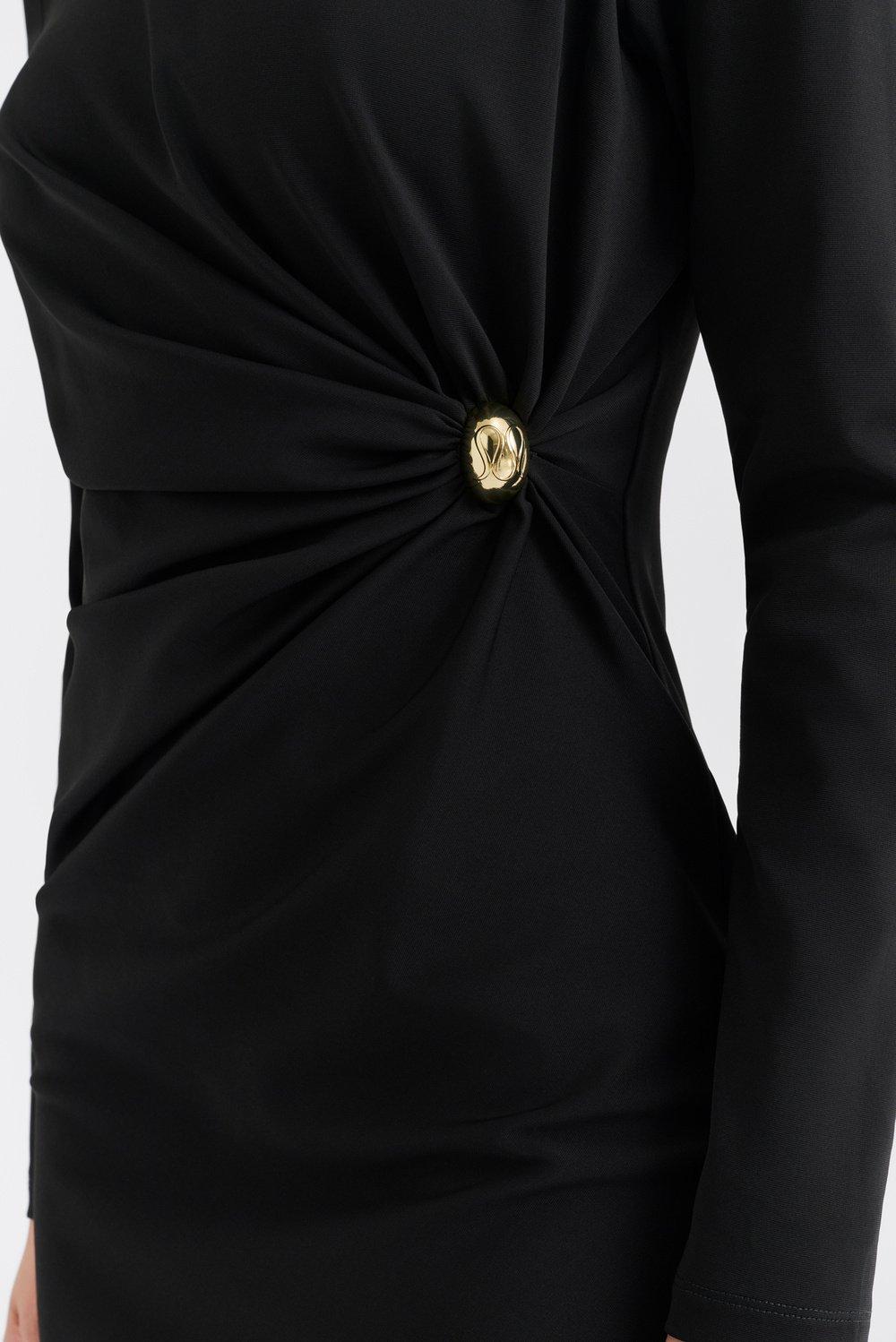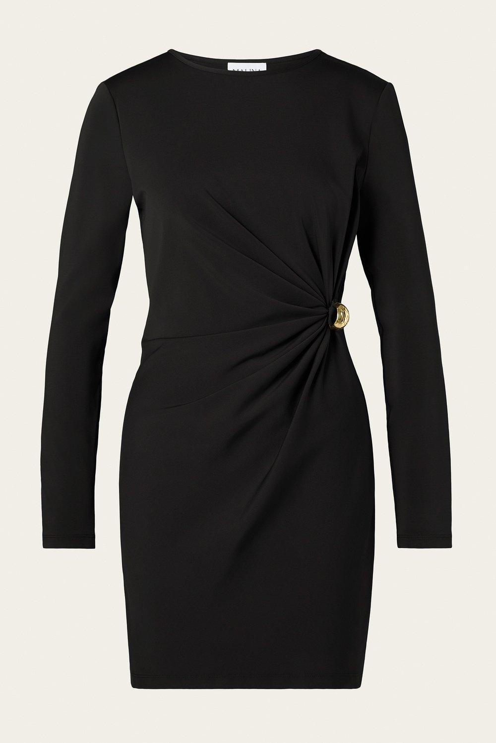 Jersey miniklänning med lång ärm, draperad midja och guldfärgad detalj.